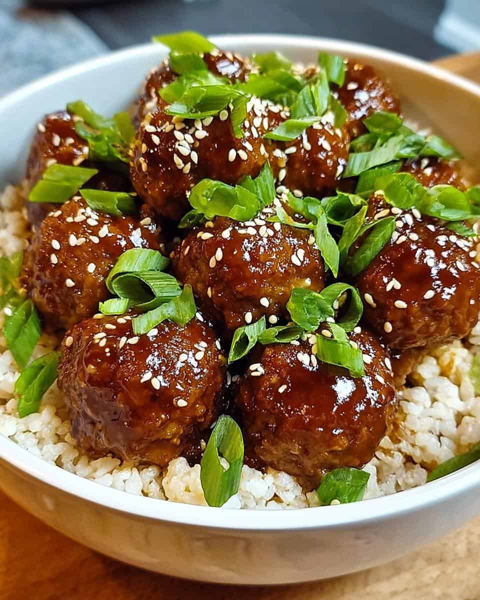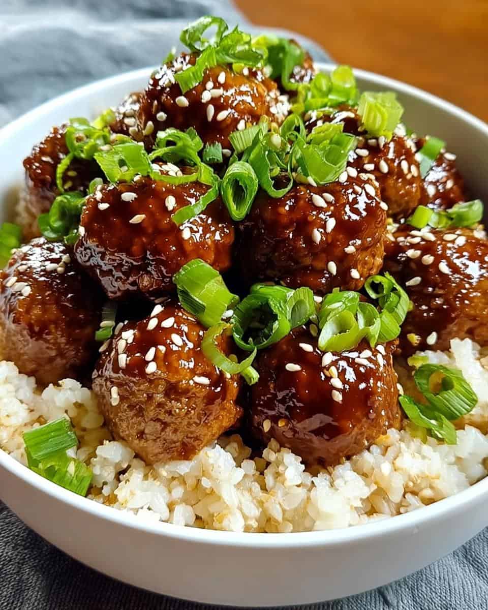 - Spoon meatballs over fluffy brown rice, drizzling with extra sauce. Garnish with sliced green onions and sesame seeds before serving.