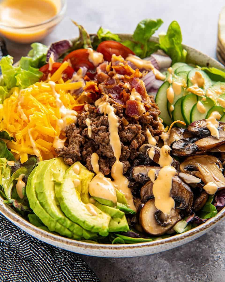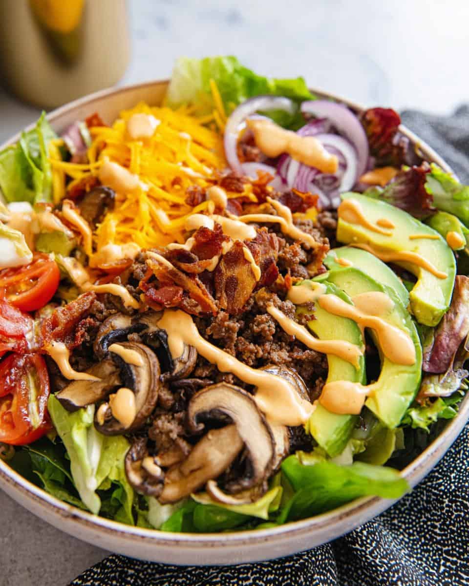 Wanna take your Burger In A Bowl Recipe No Bun Low Carb Keto to the next level? Here’s the inside scoop! First off, that sriracha in the dressing? Totally adjust it to your heat preference. I like things spicy, but you do you! And don’t be afraid to experiment with the cheese! I’m a cheddar kinda gal, but pepper jack would be amazing too. Just have fun with it and make it your own perfect, low-carb, burger bowl!