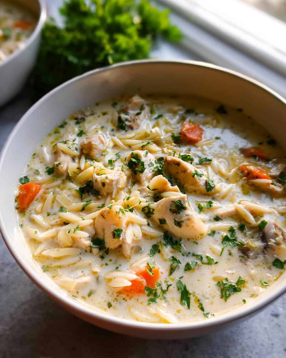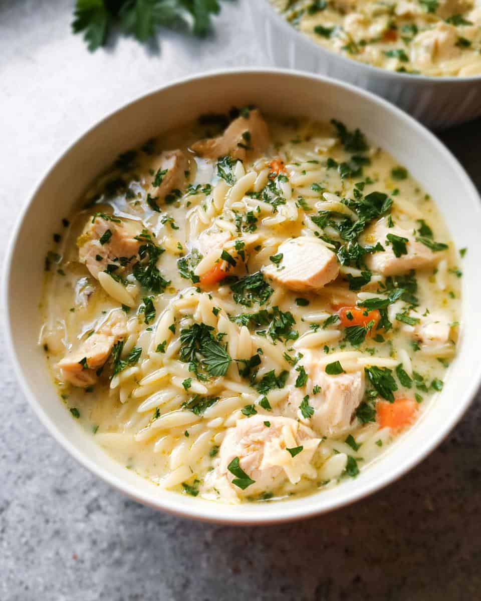 A creamy and flavorful soup featuring chicken, orzo pasta, and a hint of lemon.