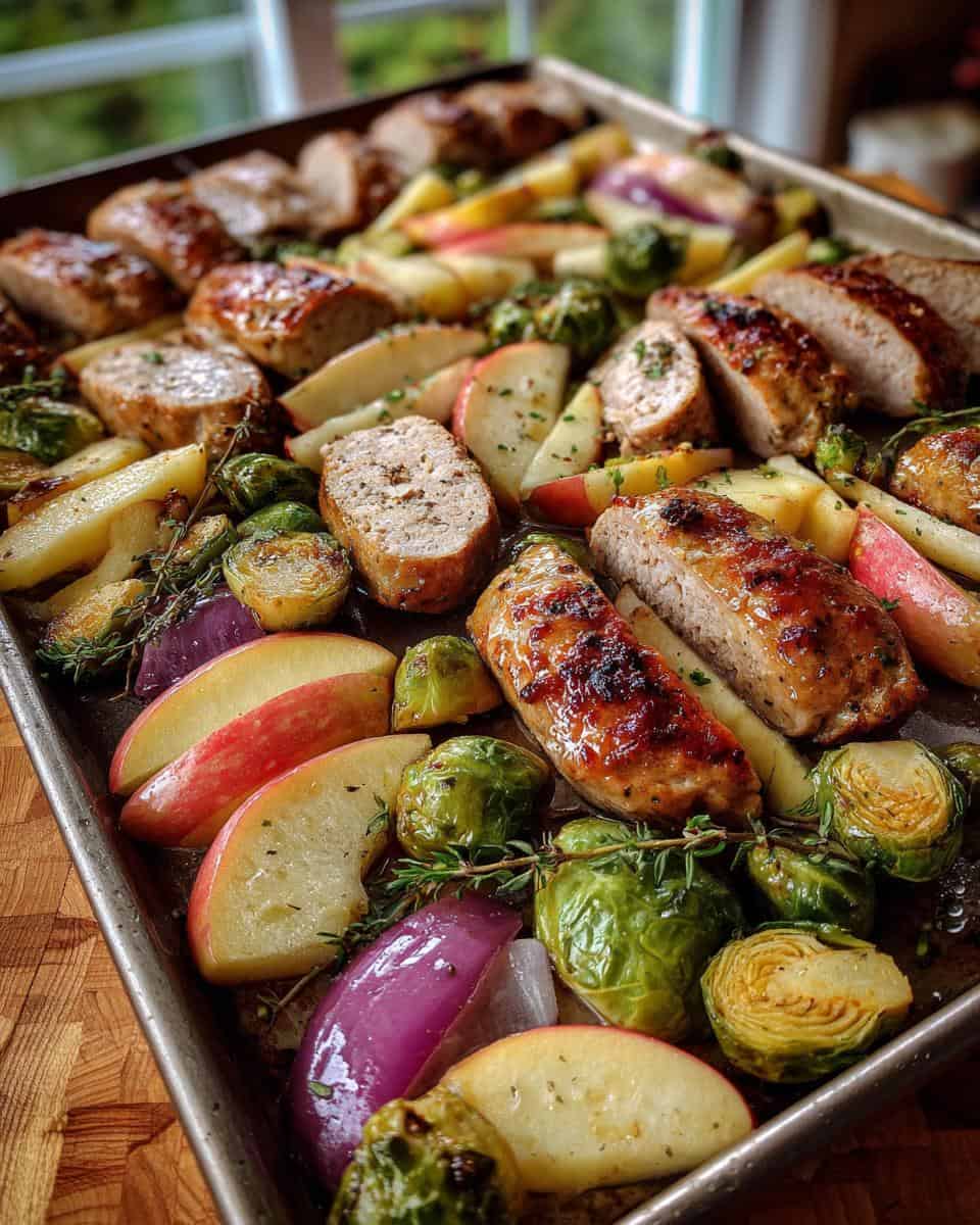 This sheet pan dinner features chicken and apple sausage, roasted vegetables, and simple seasonings for an easy and flavorful meal.
