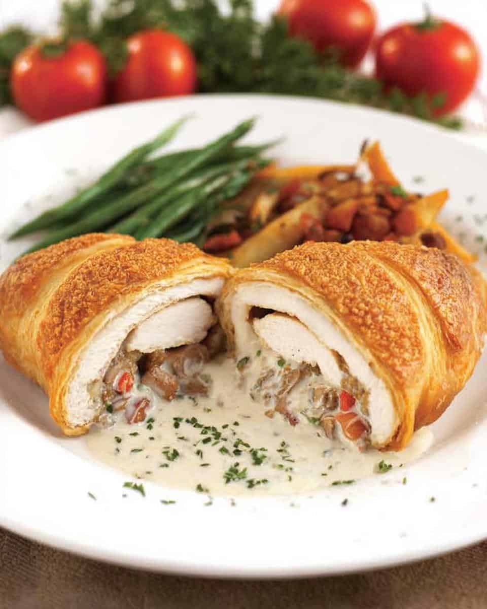 Chicken Wellington features chicken breast wrapped in puff pastry with a mushroom duxelles. Enjoy this savory dish.