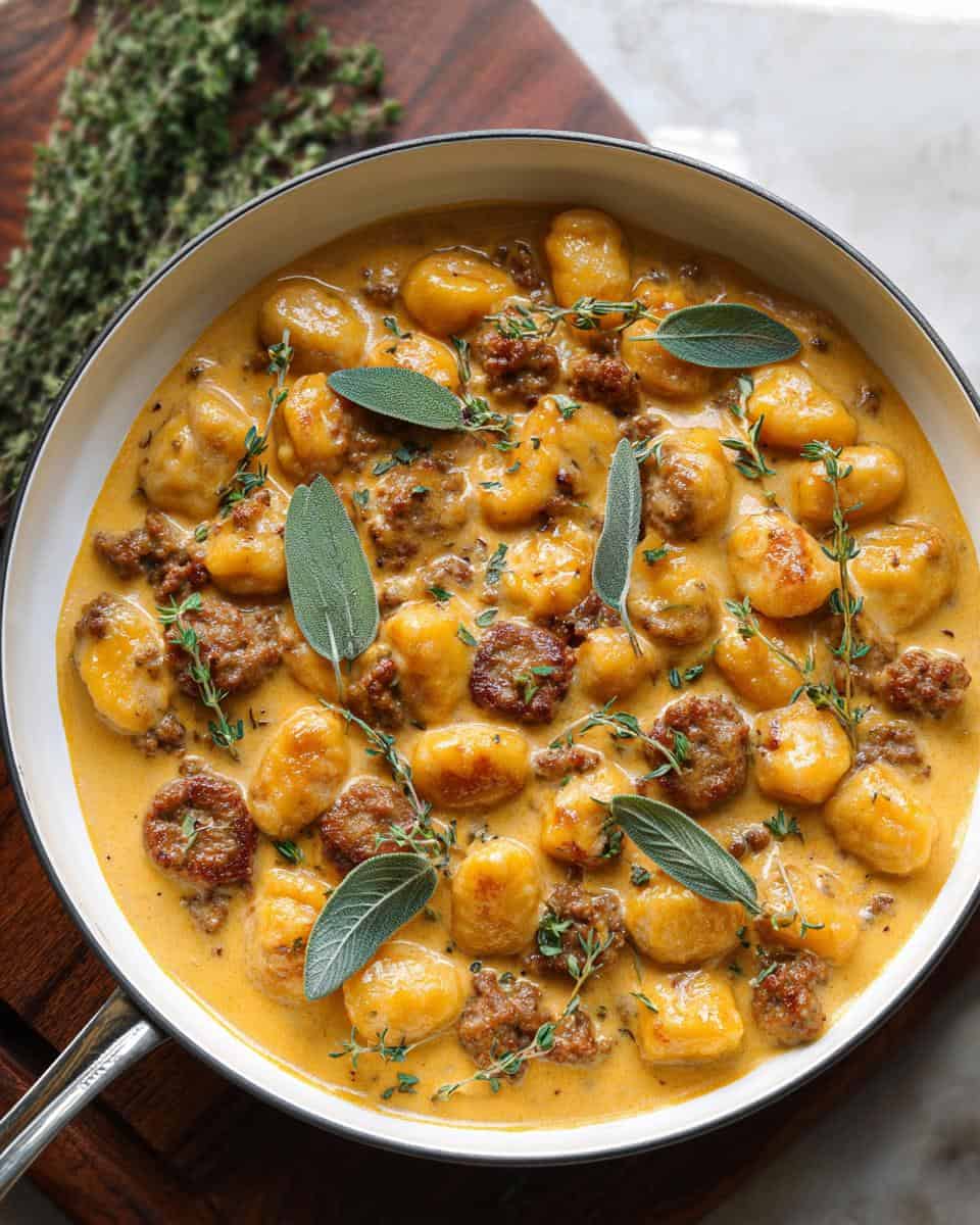 Enjoy creamy butternut squash gnocchi with sausage, thyme, and sage. This dish combines Italian sausage, potato gnocchi, and butternut squash puree in a rich, flavorful sauce.