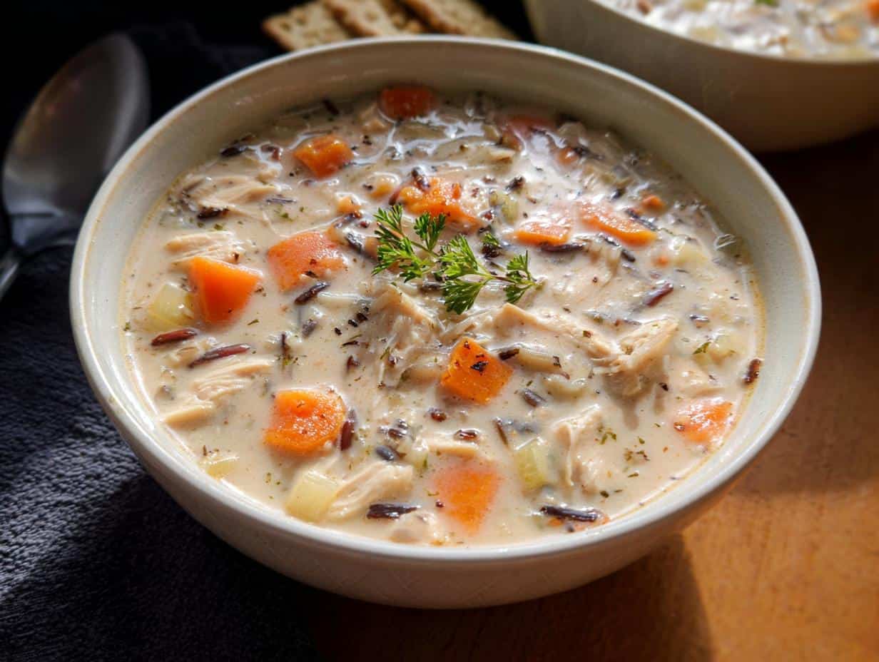 This soup features a creamy broth, tender chicken, and hearty wild rice. It is perfect for a comforting meal.