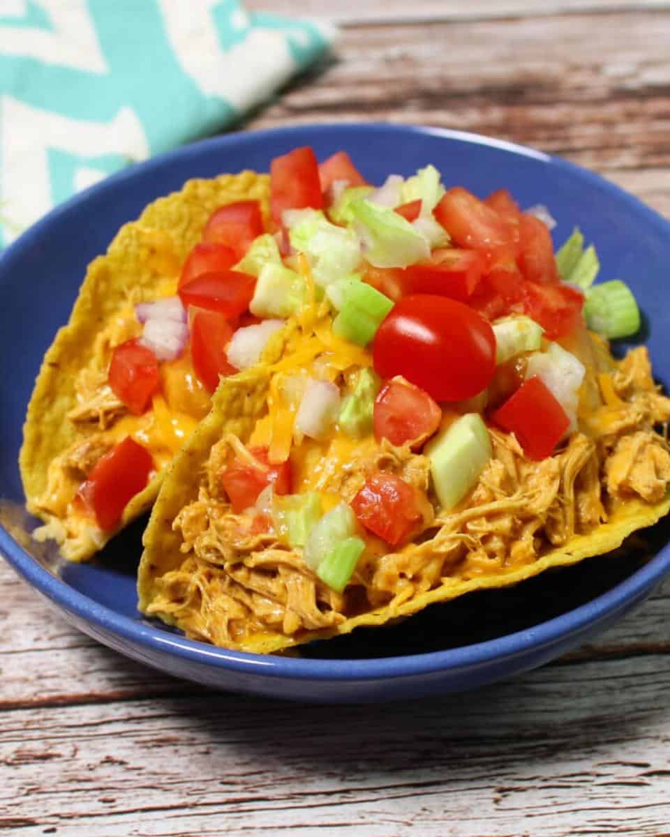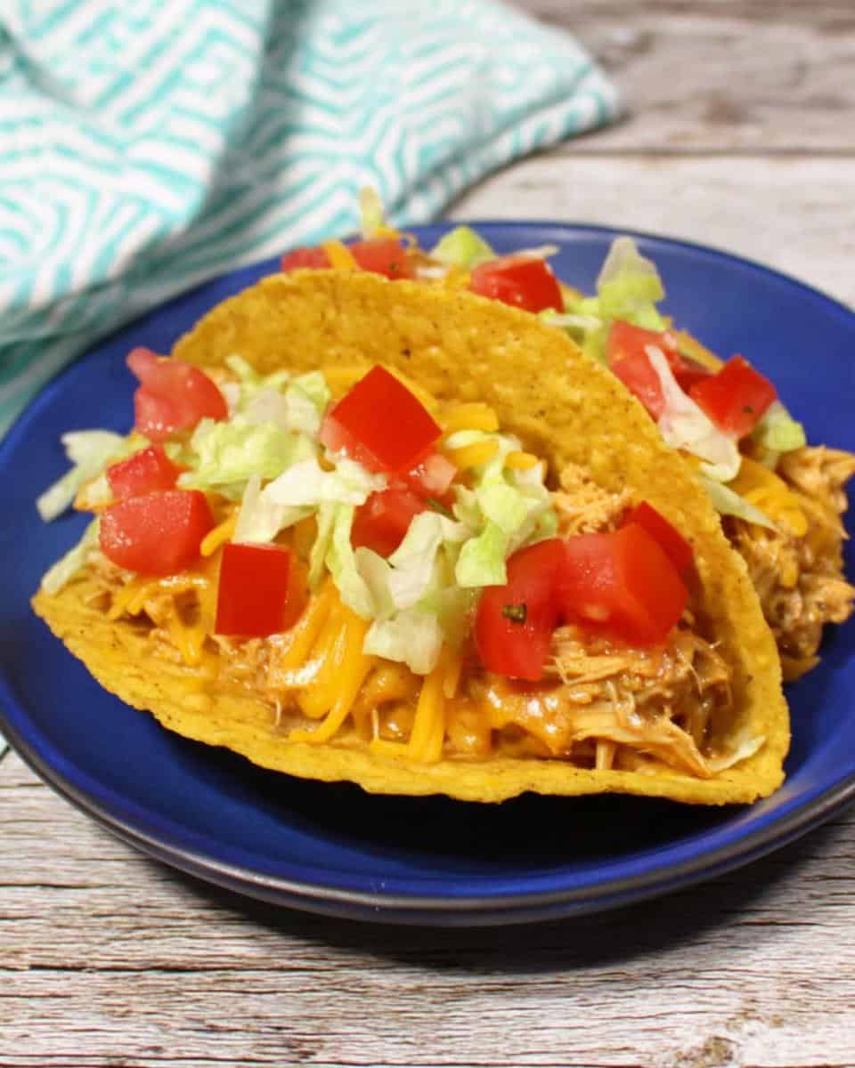 Crockpot Creamy Chicken Tacos are easy to make and delicious. You can serve them in keto cheese taco shells or with your favorite toppings.
