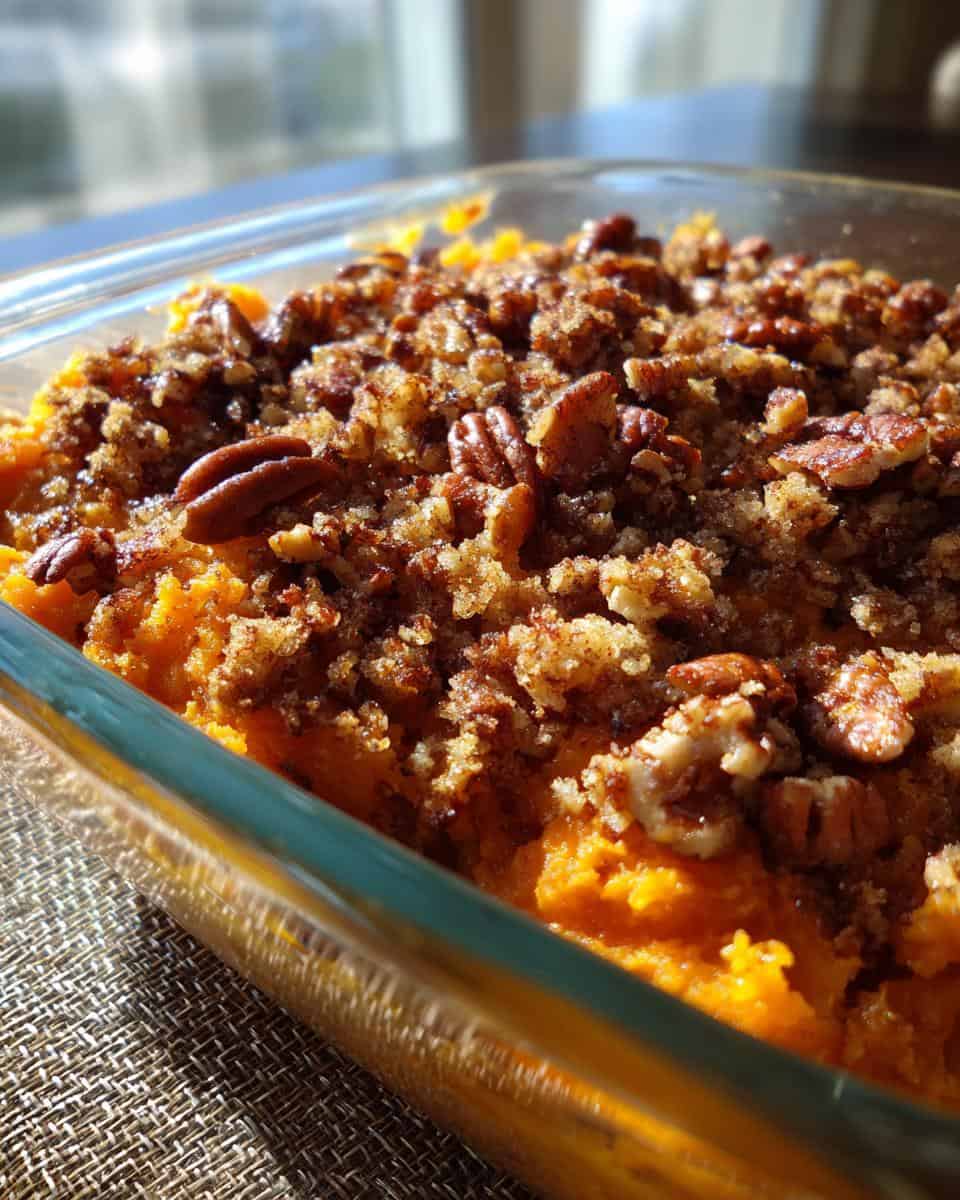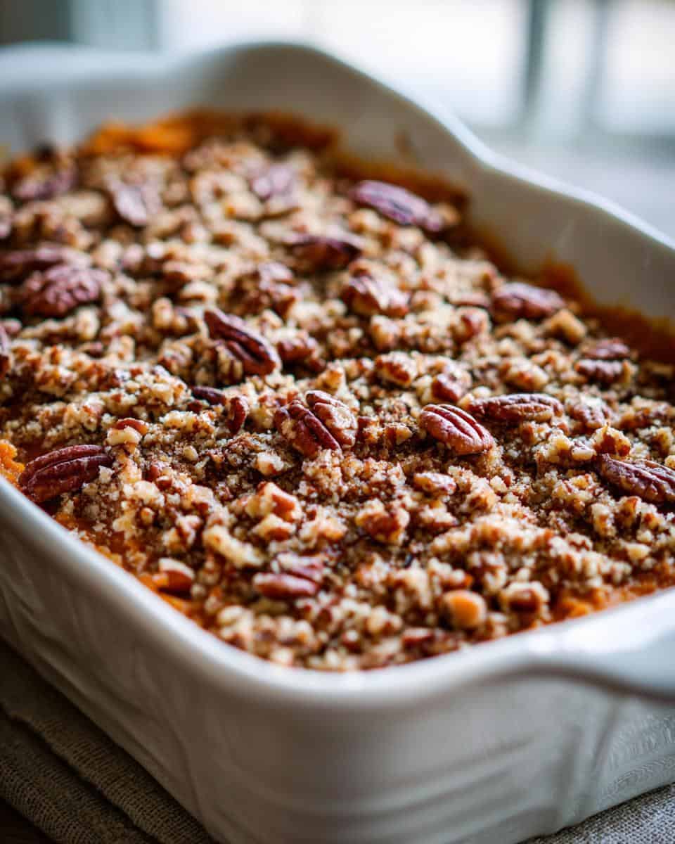 - Sprinkle pecan mixture evenly over the sweet potato mixture.