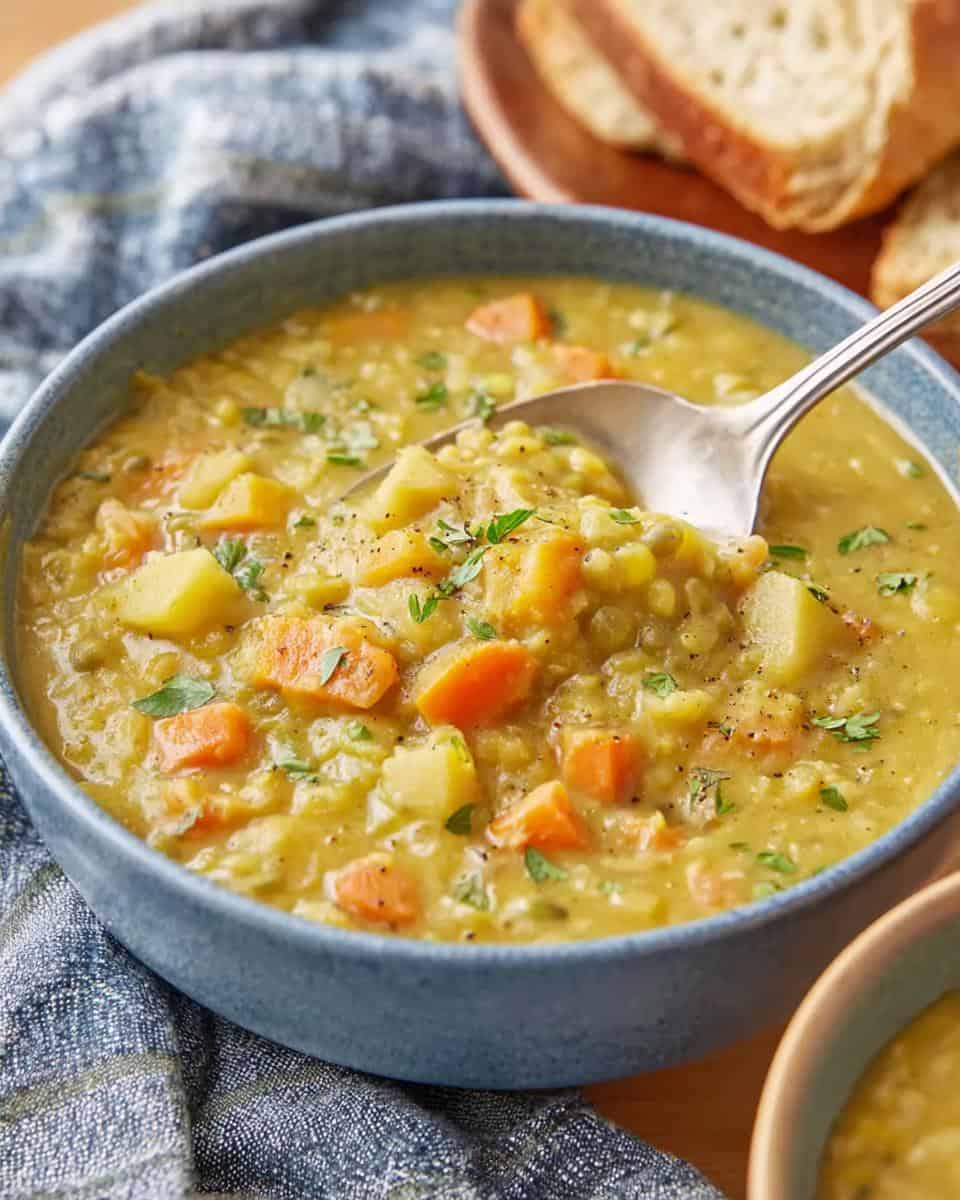 Alright, you’ve got this amazing pot of Easy Vegetarian Split Pea Soup, but what do you serve with it? Well, my go-to is always a hunk of crusty bread for dipping – seriously, it’s a must! You could also add a dollop of plain yogurt or sour cream on top for extra creaminess. And a sprinkle of fresh herbs, like parsley or thyme, makes it look extra fancy! Enjoy!