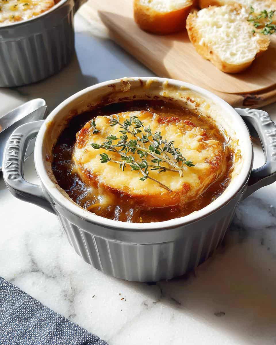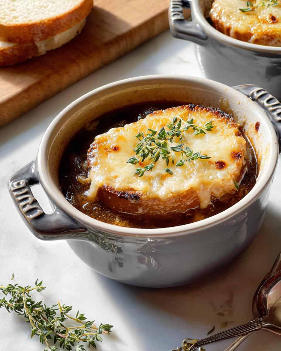 - Finally, ladle the soup into ramekins or bowls. Top each one with a cheesy baguette slice, a sprinkle of fresh thyme, and a pinch of red pepper flakes if you want a little heat. Boom! You did it!