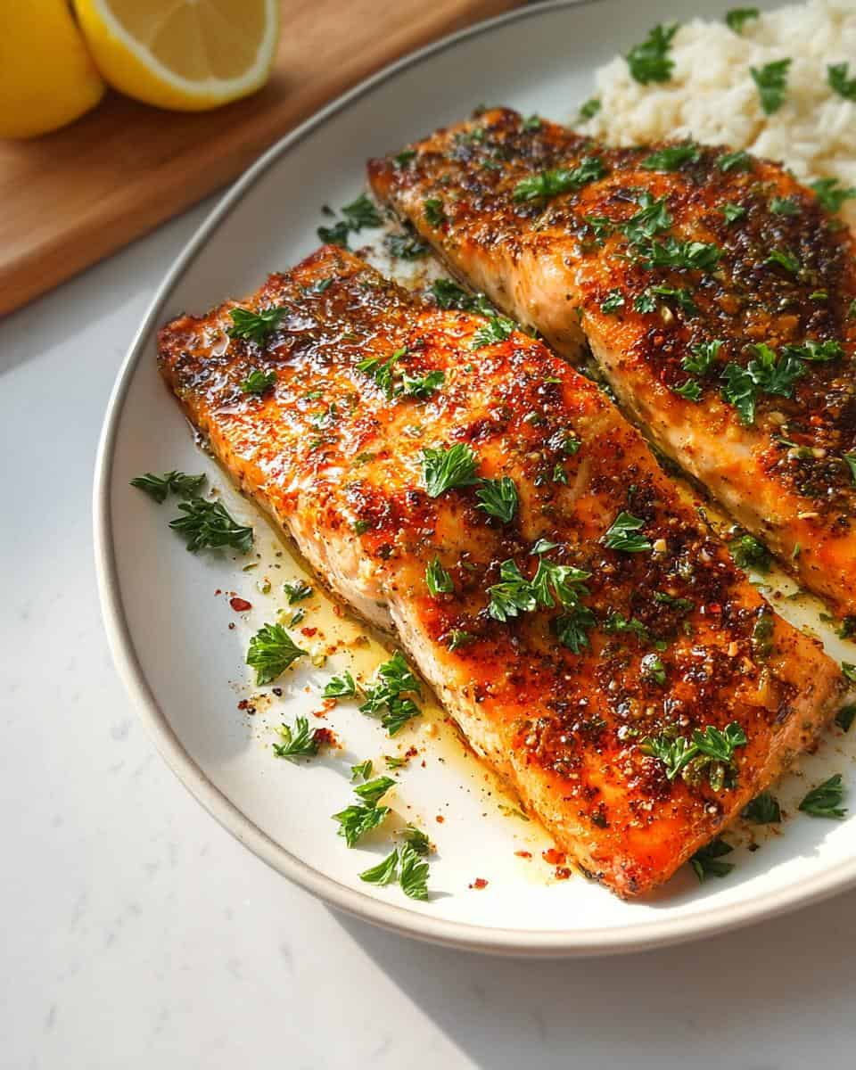 - Let the salmon rest for 5 minutes before serving. Sprinkle with fresh parsley to garnish.