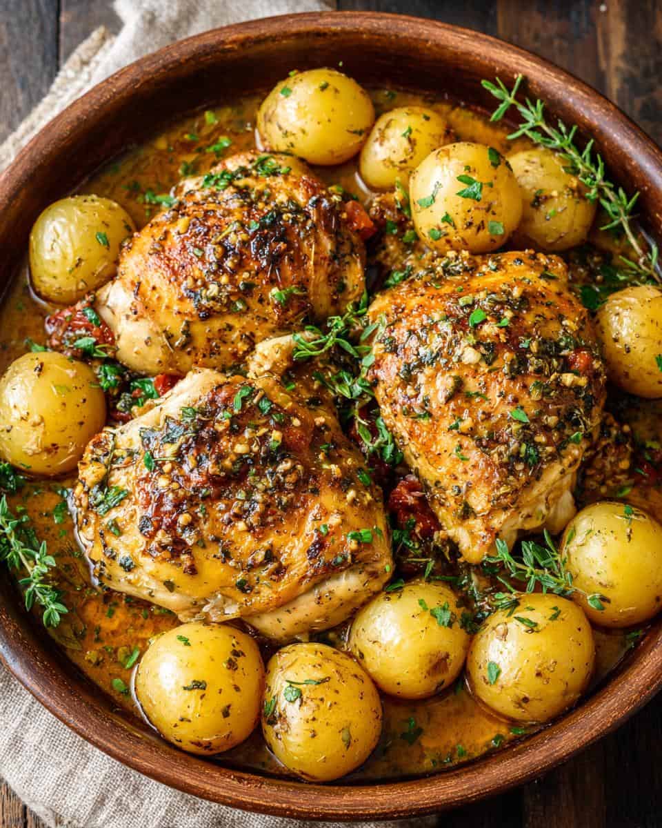 - Pour the mixture over the chicken and potatoes.