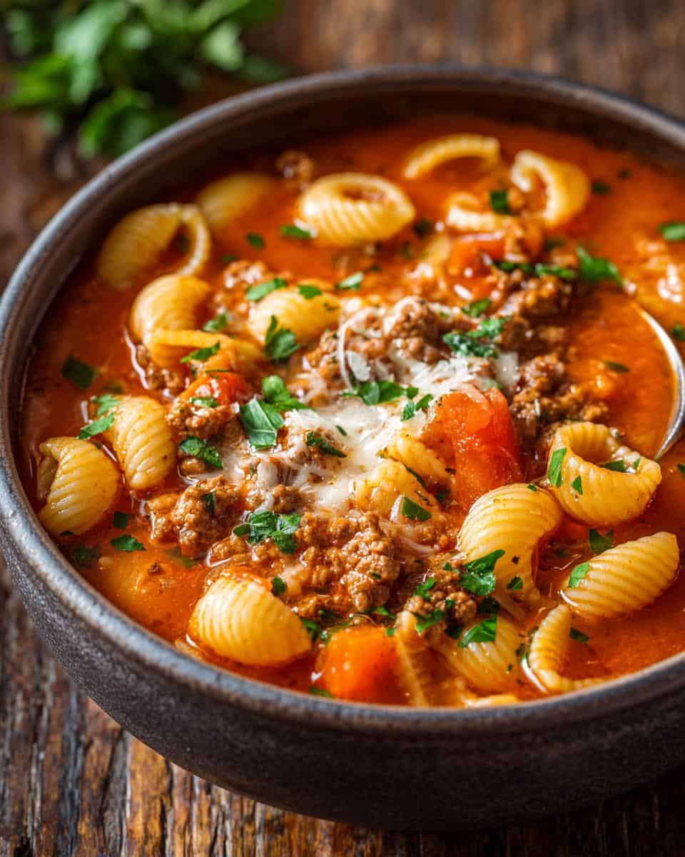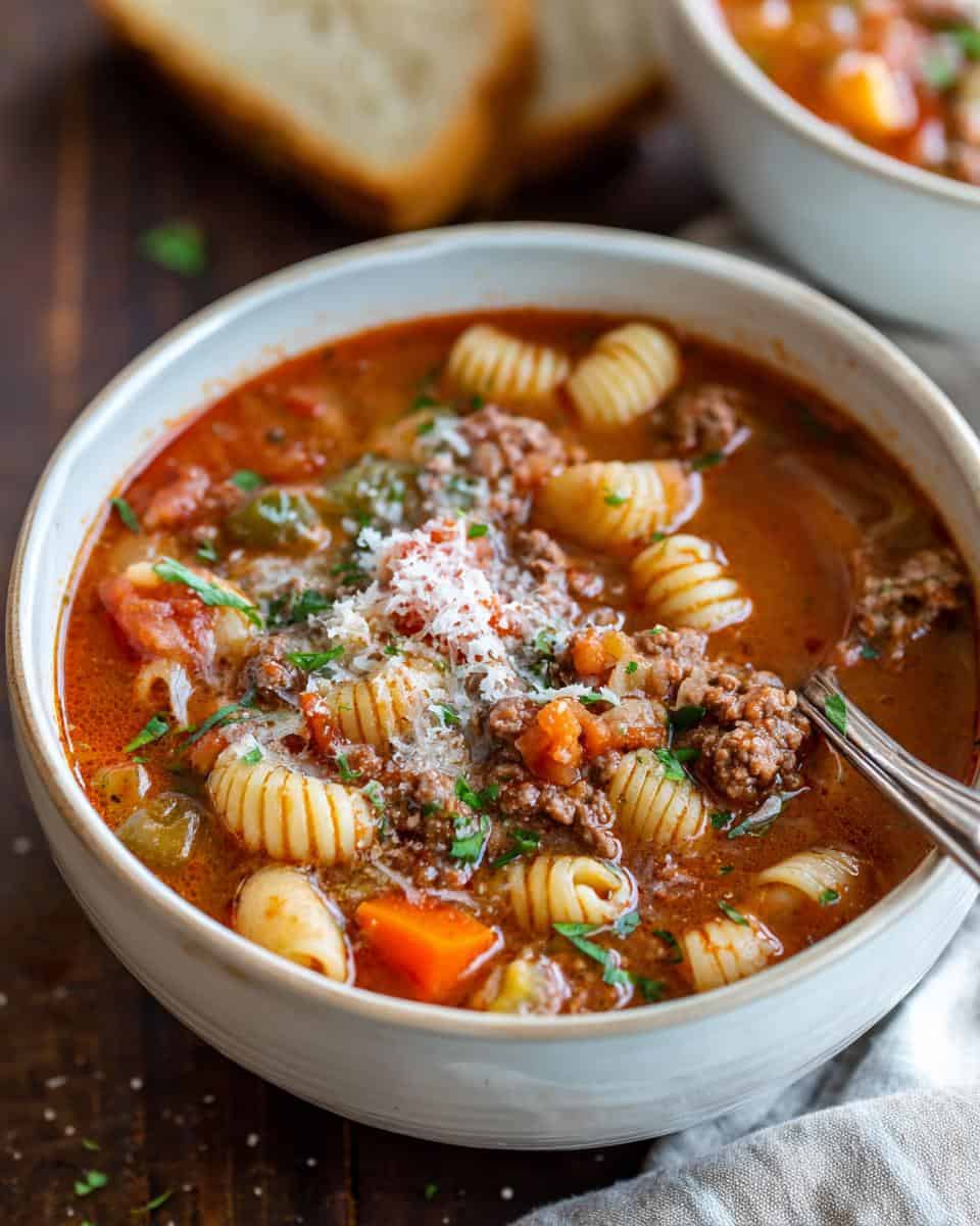 Hearty Italian Ground Beef Pasta Soup is a flavorful and comforting meal.