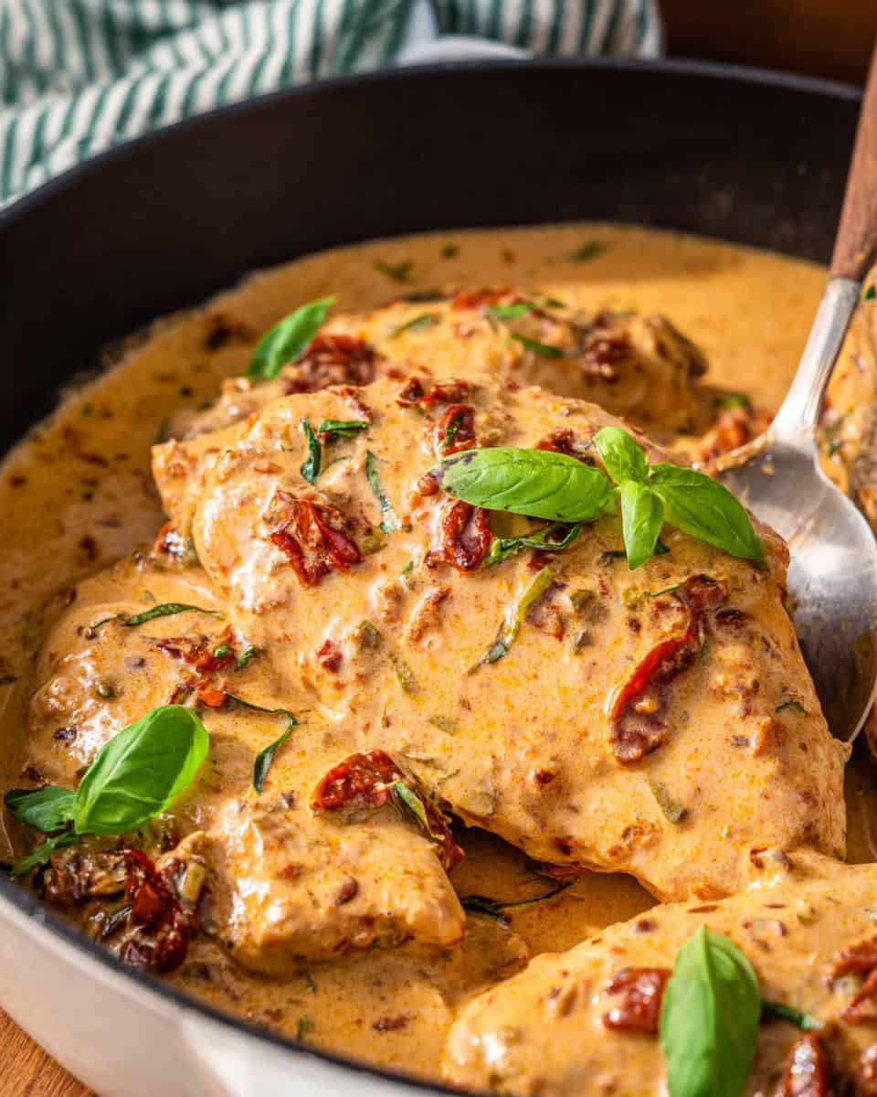 Grab 1/2 cup of oil-packed sun-dried tomatoes, minced (drain ’em first!), 1/4 cup of chicken broth, and some fresh basil for garnish. Because presentation matters!