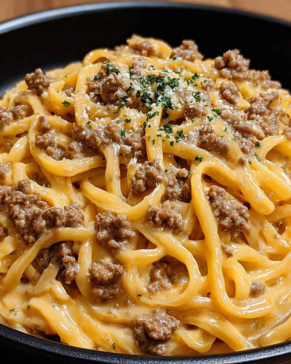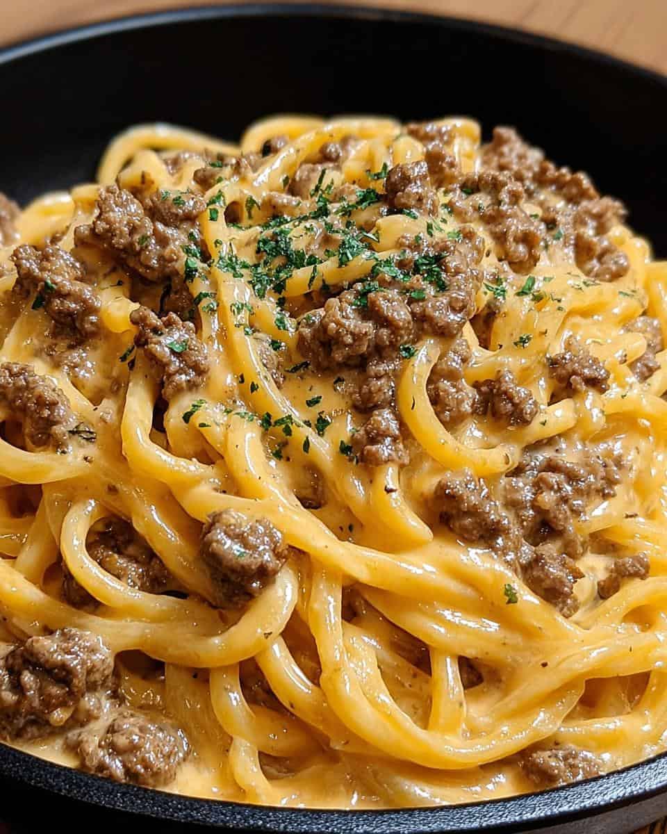 Easy one-pot pasta with ground beef, garlic butter, and a creamy sauce.