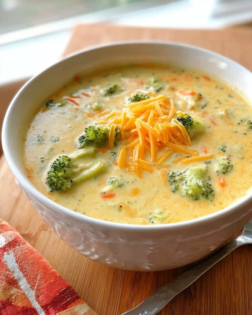 Enjoy a warm and comforting bowl of Paneras Broccoli Cheddar Soup. This recipe offers a creamy and cheesy delight with tender broccoli and carrots.