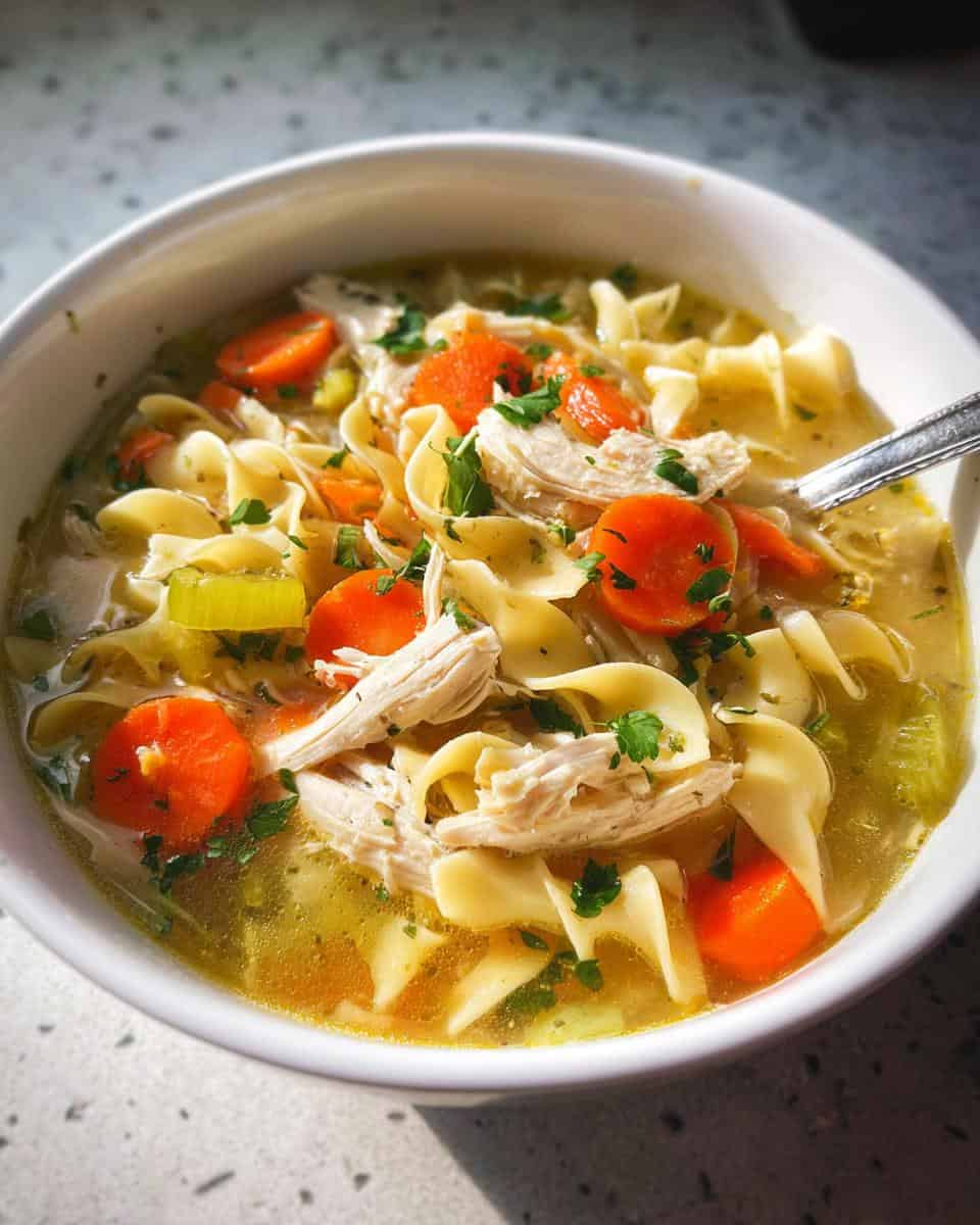 Quick and easy chicken noodle soup with rotisserie chicken, packed with flavor and tender ingredients.