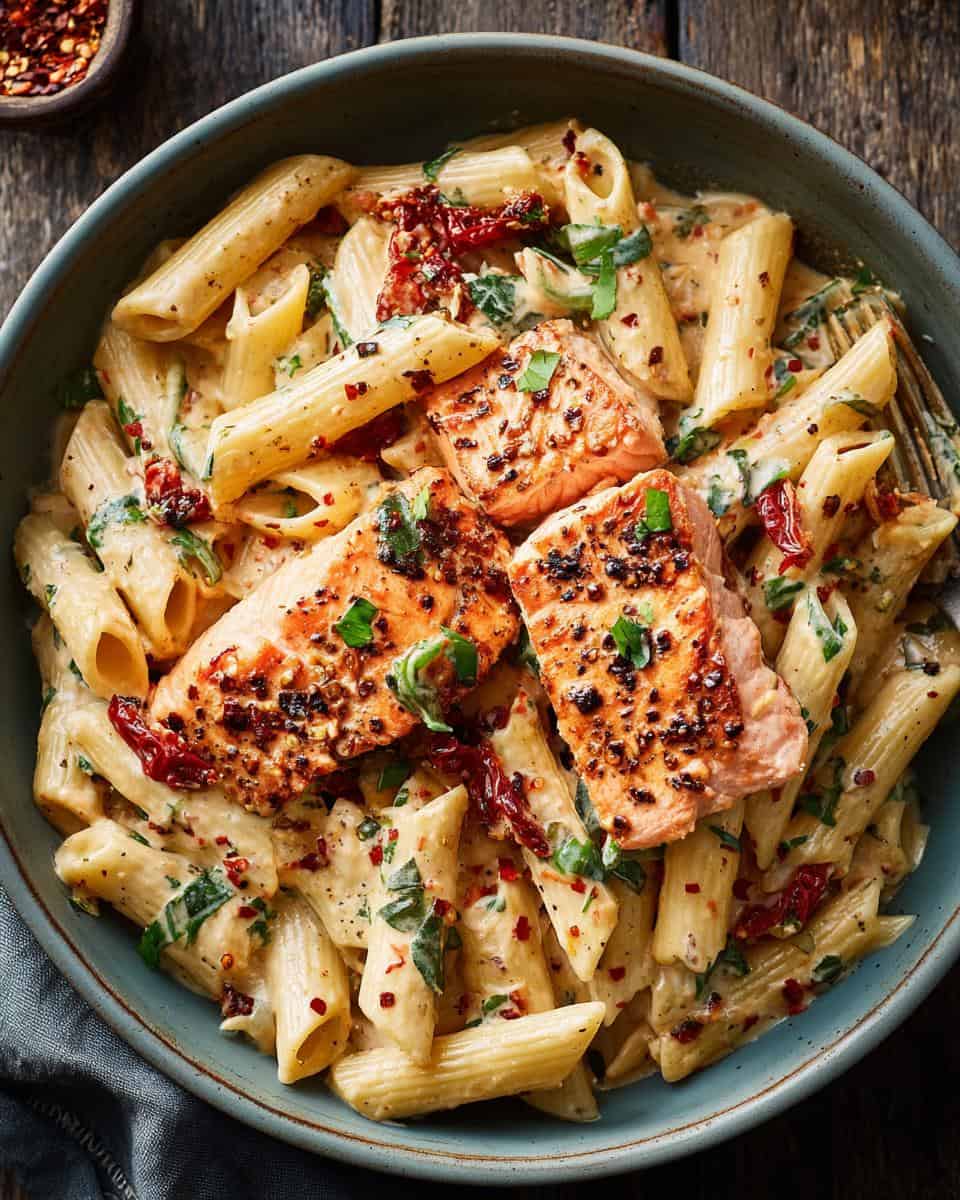 Enjoy a creamy and flavorful Salmon Pasta with Sun-Dried Tomato Cream Sauce. This dish combines flaky salmon with a rich, sun-dried tomato sauce, perfect for a satisfying meal.