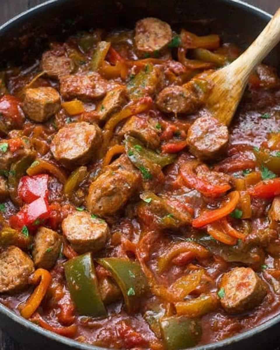 Sausage and Peppers is a flavorful dish with Italian sausages, bell peppers, and onions simmered in a rich tomato sauce.