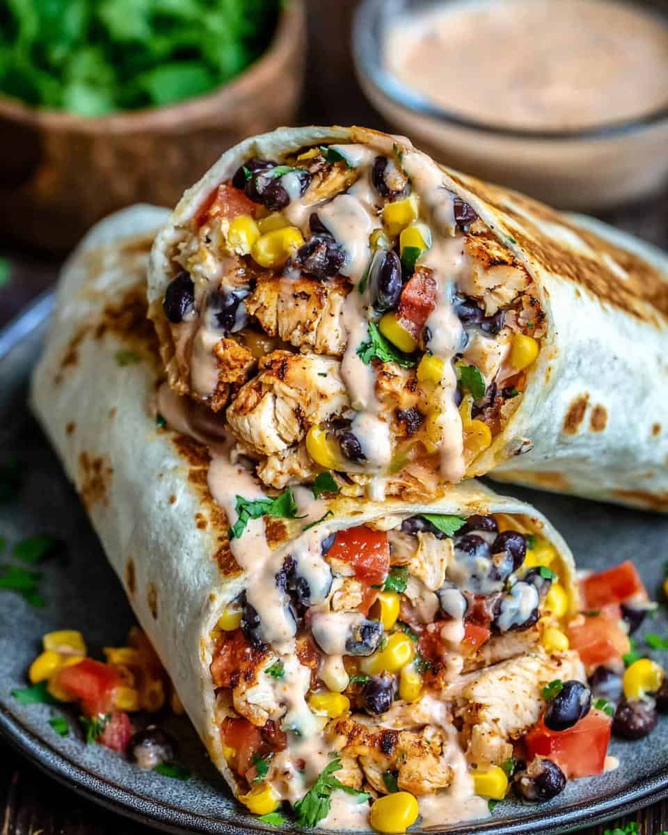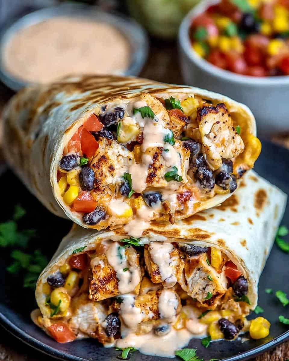 - Warm tortillas, then assemble wraps with rice, chicken mixture, beans, corn, cheese, and sauce.