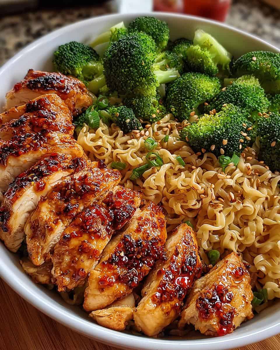Quick and easy Spicy Garlic Chicken and Broccoli Noodle Bowls. Prepare a flavorful meal in minutes.
