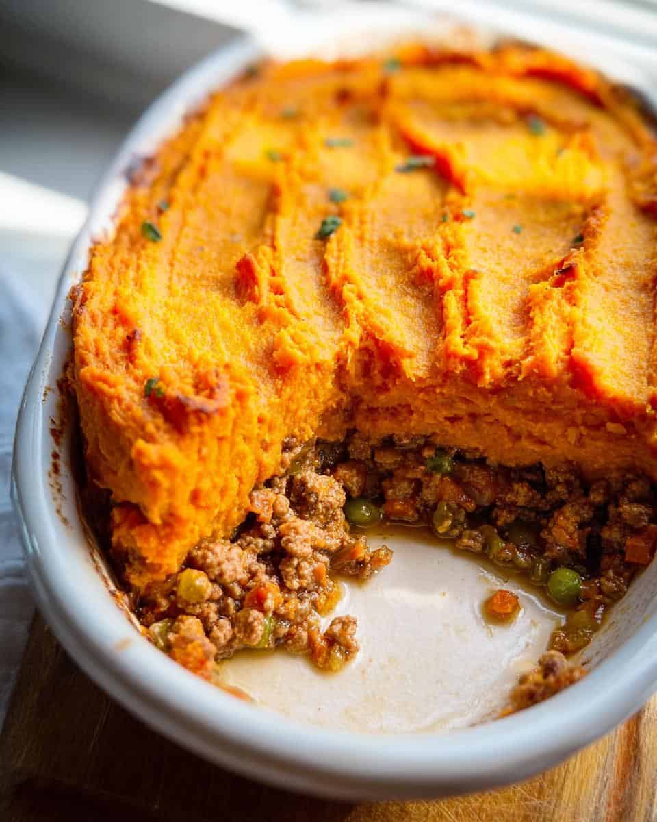 A comforting and healthy Sweet Potato Shepherd’s Pie recipe. It features a savory meat and vegetable filling topped with creamy mashed sweet potatoes.