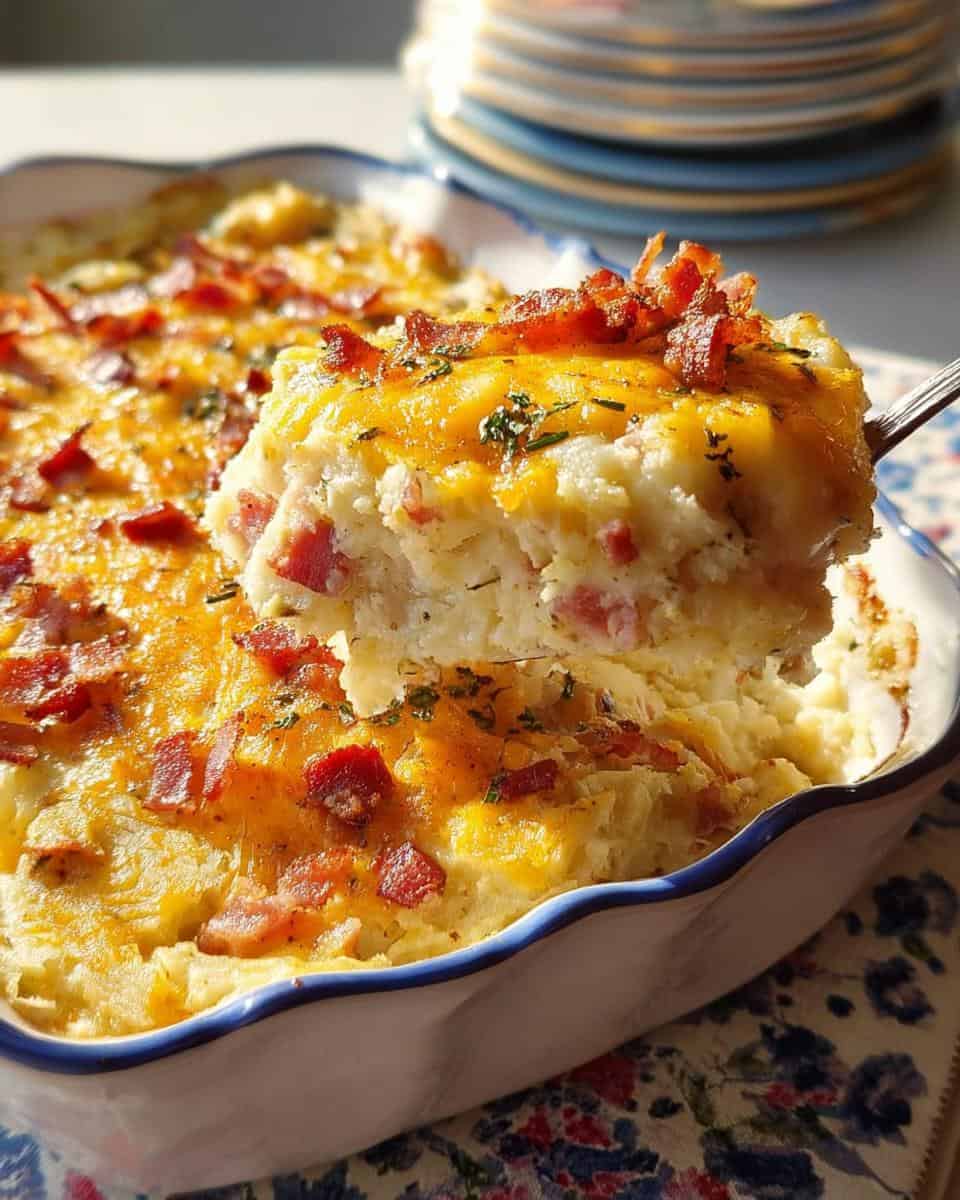 Enjoy this comforting Twice Baked Potato Casserole with Turkey Bacon and Cheddar. It’s a hearty and flavorful dish perfect for family meals.