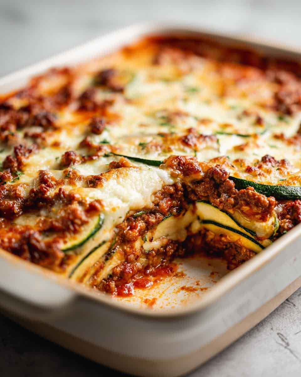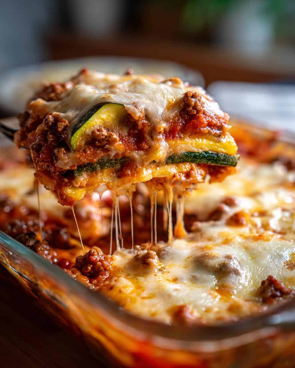 Time to layer! Grab your 9×13 inch baking dish. Lay down half of those zucchini slices in a nice, even layer. Then, spoon half of the meat sauce on top. Sprinkle with half of that glorious mozzarella cheese. Almost there!